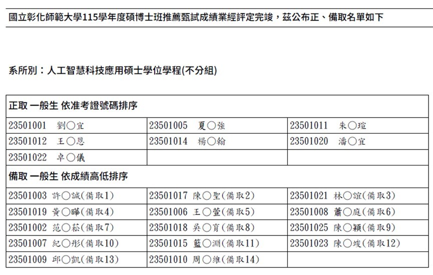 2.正備取生報到通知單(含擇優免複試直接錄取者)於11月21日以限時郵件寄出,正備取生錄取通知單另E-mail至考生登錄報名系統之電子信箱。