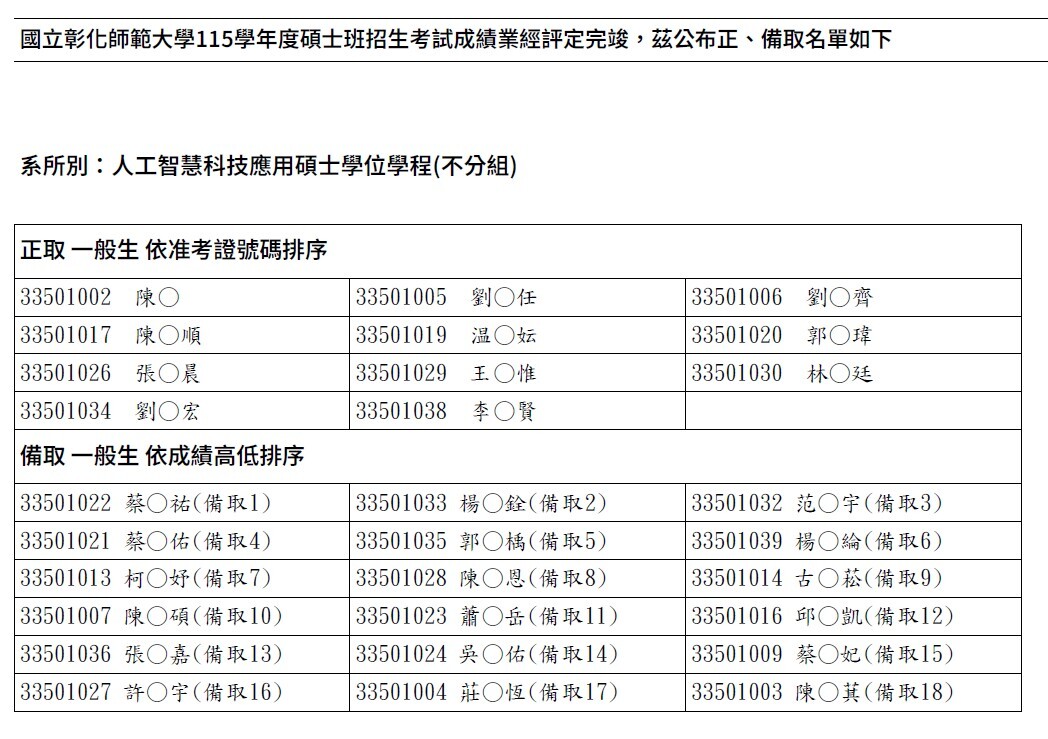本校115學年度碩士班考試招生錄取名單
